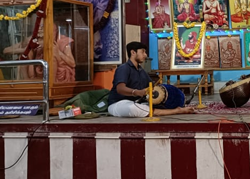 Mridangam music classes begin with the basics, including understanding the parts of the mridangam, proper playing posture, and hand techniques. Students start with basic strokes like Tha, Dhi, Thom, and Nam, followed by simple rhythmic exercises in Adi Tala. As they progress, they learn more complex patterns, mohra, korvai, and different talas like Rupaka and Misra Chapu. Intermediate lessons focus on accompaniment techniques for Carnatic compositions, improving speed, and developing rhythmic precision. Advanced training includes intricate tani avartanam (solo improvisation), cross-rhythms, and concert performance skills.
